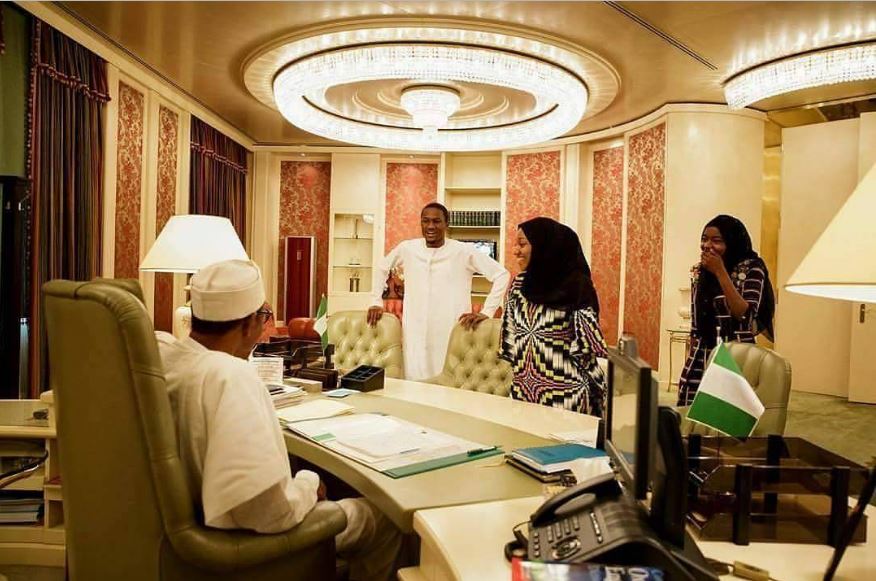 President Muhammadu Buhari was pictured with his Lookalike son, Yusuf Buhari and daughters at the State House, Abuja.