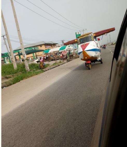 'Engineer' Godspower based in the Ugheli North area of Delta State has designed a tricycle in the shape of an aeroplane.