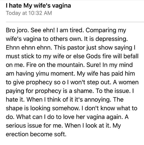 A man has taken to social media to complain bitterly about his wife's v*gina which he finds ugly.