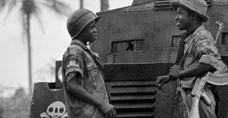Two children soldiers of the Biafran army, Moise, 14 (L) and Ferdinand, 16 (R) discuss in Umuahia on August 31, 1968 as the Nigerian federal troops continue their advance during the Biafran war. A civil war opposing Biafra secessionnist tribes fighting for independance and the federal troops killed between one and two milllion people, most from hunger and disease, from 1967 to 1970 in the Biafra region in south-eastern Nigeria. / AFP PHOTO / Francois Mazure