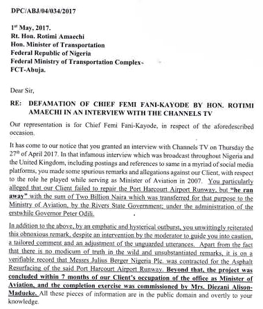We reported on Monday that while speaking at a Channels TV programme, 'Hard Copy' which was anchored by Maupe Ogun, the Minister of Transportation, Hon. Rotimi Amaechi, accused the former Minister of Aviation, Femi Fani-Kayode of embezzling N2billion earmarked for the reconstruction of Port Harcourt International Airport.