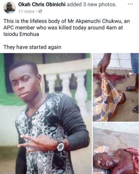 Okah Chris Obinichi who shared the sad story on Facebook wrote: 'This is the lifeless body of Mr Akpenuchi Chukwu, an APC member who was killed today around 4am at Isiodu Emohua.